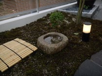 隣の照明が30cmくらいの高さですので、手水鉢が形、品良くこぢんまりとしているのが見てとれますね。