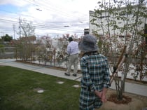 今日は、お客さまのお宅で職人さんのご協力のもと、防除(消毒)作業の実演をさせてもらいました。