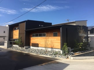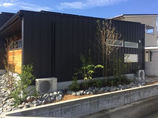 黒いガルバ壁にレッドシーダ、