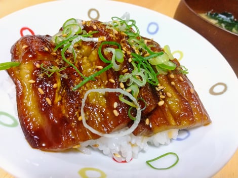 昨夜は、フラチルで収穫した茄子を鰻に見立てて蒲焼丼。