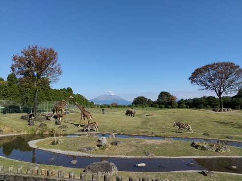 鹿児島の平川動物園は、入場してすぐ、桜島を背景にアフリカ園が広がっています。